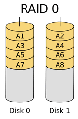 RAID 0 bietet gesteigerte Transferraten, indem die beteiligten Festplatten in zusammenhängende Blöcke gleicher Größe aufgeteilt werden, wobei diese Blöcke quasi im Reißverschlussverfahren zu einer großen Festplatte angeordnet werden. Somit können Zugriffe auf allen Platten parallel durchgeführt werden (engl. striping, was „in Streifen zerlegen“ bedeutet, abgeleitet von stripe, der „Streifen“). Die Datendurchsatz-Steigerung (bei sequentiellen Zugriffen, aber besonders auch bei hinreichend hoher Nebenläufigkeit) beruht darauf, dass die notwendigen Festplatten-Zugriffe in höherem Maße parallel abgewickelt werden können. Die Größe der Datenblöcke wird als Striping-Granularität (auch stripe size, chunk size oder interlace size) bezeichnet. Meistens wird bei RAID 0 eine chunk size von 64 kB gewählt. >> mehr Info